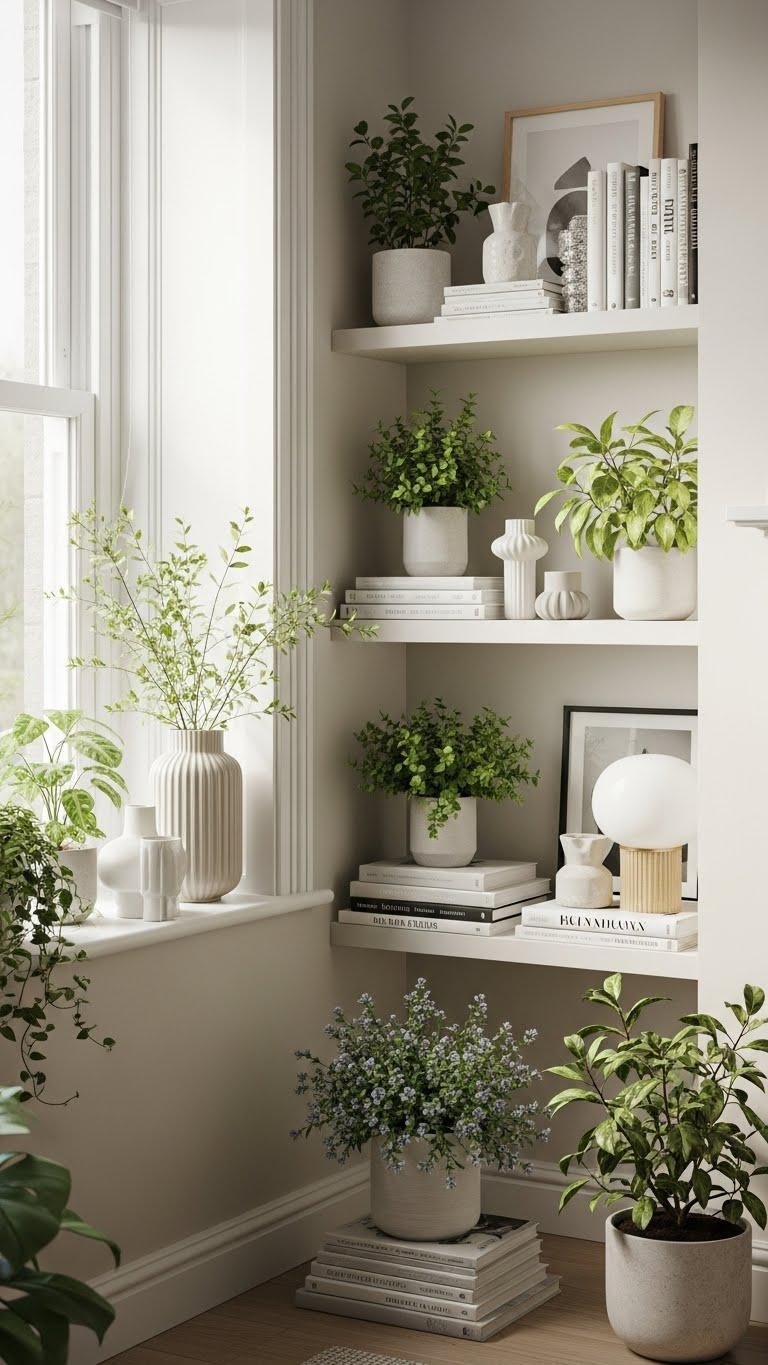 Lean into window ledges and chimney-breast shelving to add depth and function without stealing floor space; you can layer plants, books, and curated objects to create a lived-in focal point that still reads clean and intentional. Use shallow shelves for sunlit displays and transform ledges into plant havens.