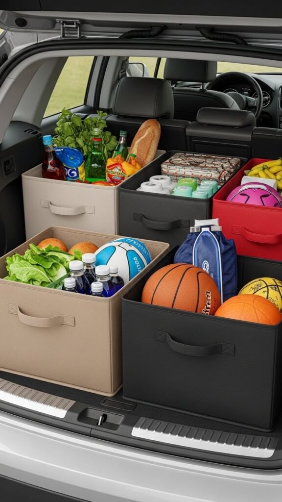 Stash fabric bins with handles in your car trunk to keep groceries, sports gear, and emergency supplies from rolling around.
