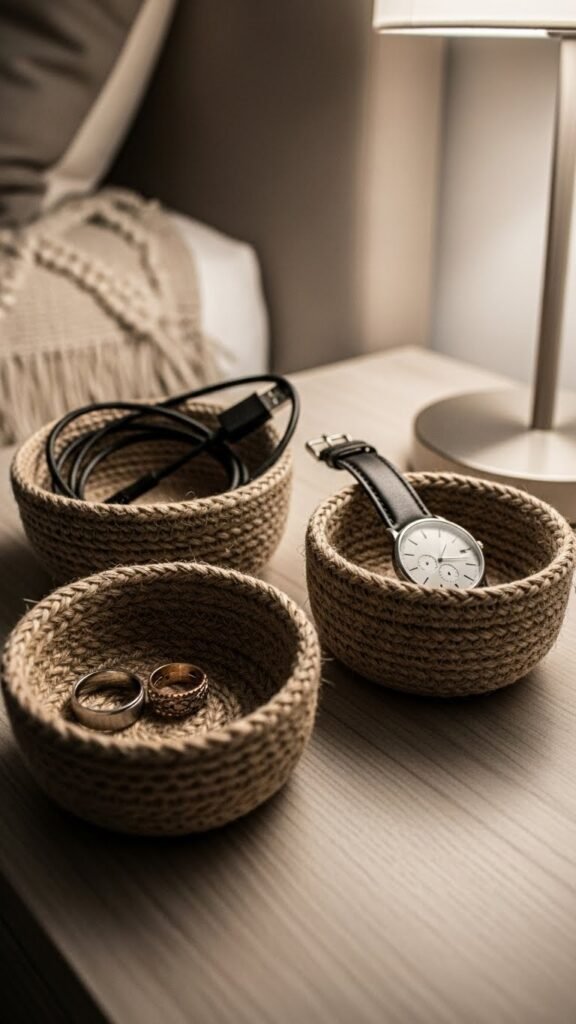 If lidded seagrass baskets keep your linens tidy on shelves, you can bring the same natural texture to your nightstand with small jute bowls for everyday items. You’ll corral rings, watch, and phone charger in a compact, tactile piece that mixes boho texture with bedside minimalism.