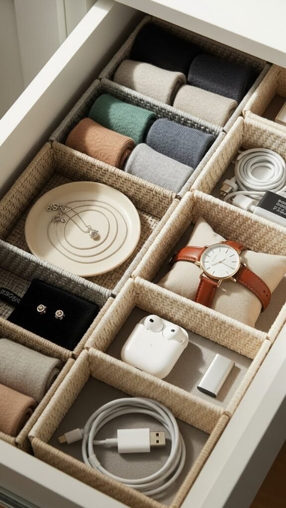 You’ll love minimalist dividers that create textured compartments for socks, accessories, and tech bits.
