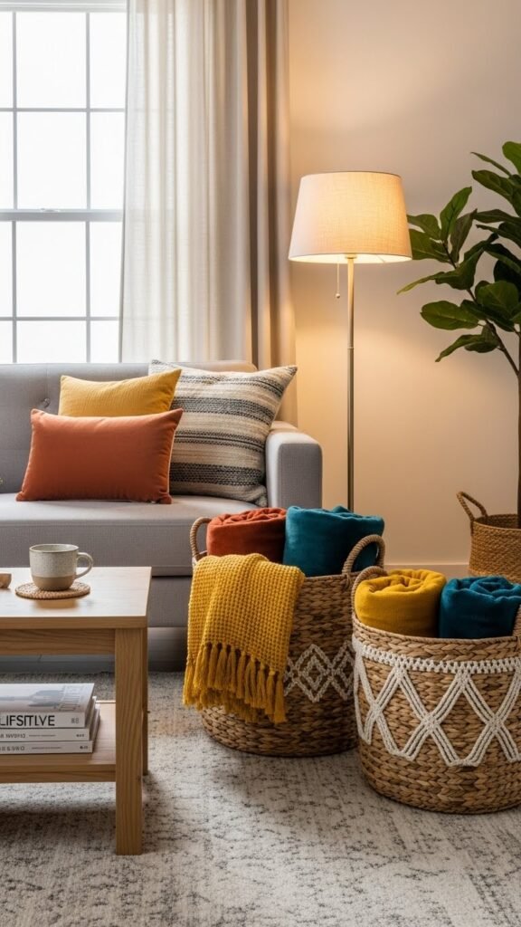 Place them under benches or on shelves for easy access. Natural texture keeps spaces calm while freeing you to change scenes quickly.