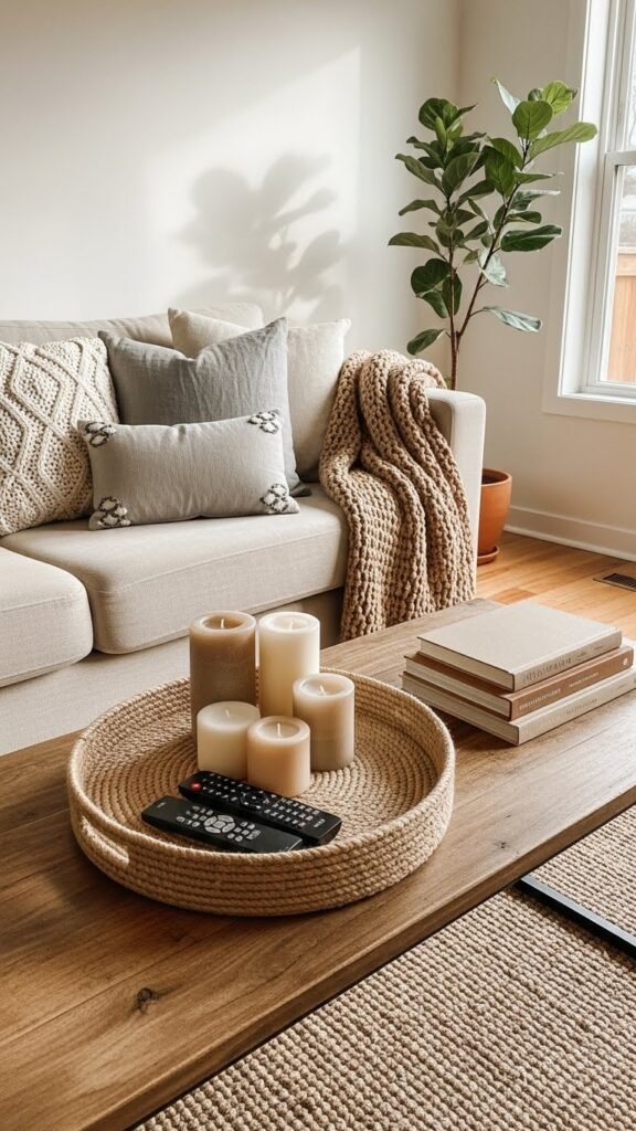 Once laundry baskets are out of the way, bring the same sense of order to your living room with a jute tray on the coffee table. You’ll corral remotes, candles, and small books with a low-profile piece that adds natural texture and complements a neutral palette. It’s minimalist, tactile, and keeps surfaces clear so you can relax and move freely.