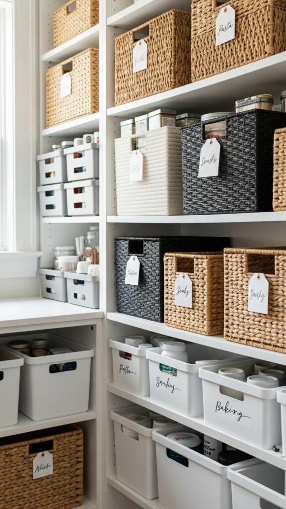 A coordinated set of baskets instantly brings order to your pantry, making it easy to group like items and maintain a clean visual flow.